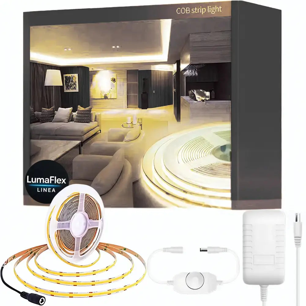 Transform your interior with the LumaFlex Linea COB LED Strip Kit, an eco-friendly solution designed for effortless DIY lighting projects. Experience a warm, inviting glow, perfect for creating ambiance in bedrooms, adding task lighting to kitchens, or highlighting unique architectural features. Unlike traditional LED strips, this kit delivers ultra-bright, dotless illumination across a wide 180° beam angle, ensuring even light distribution.