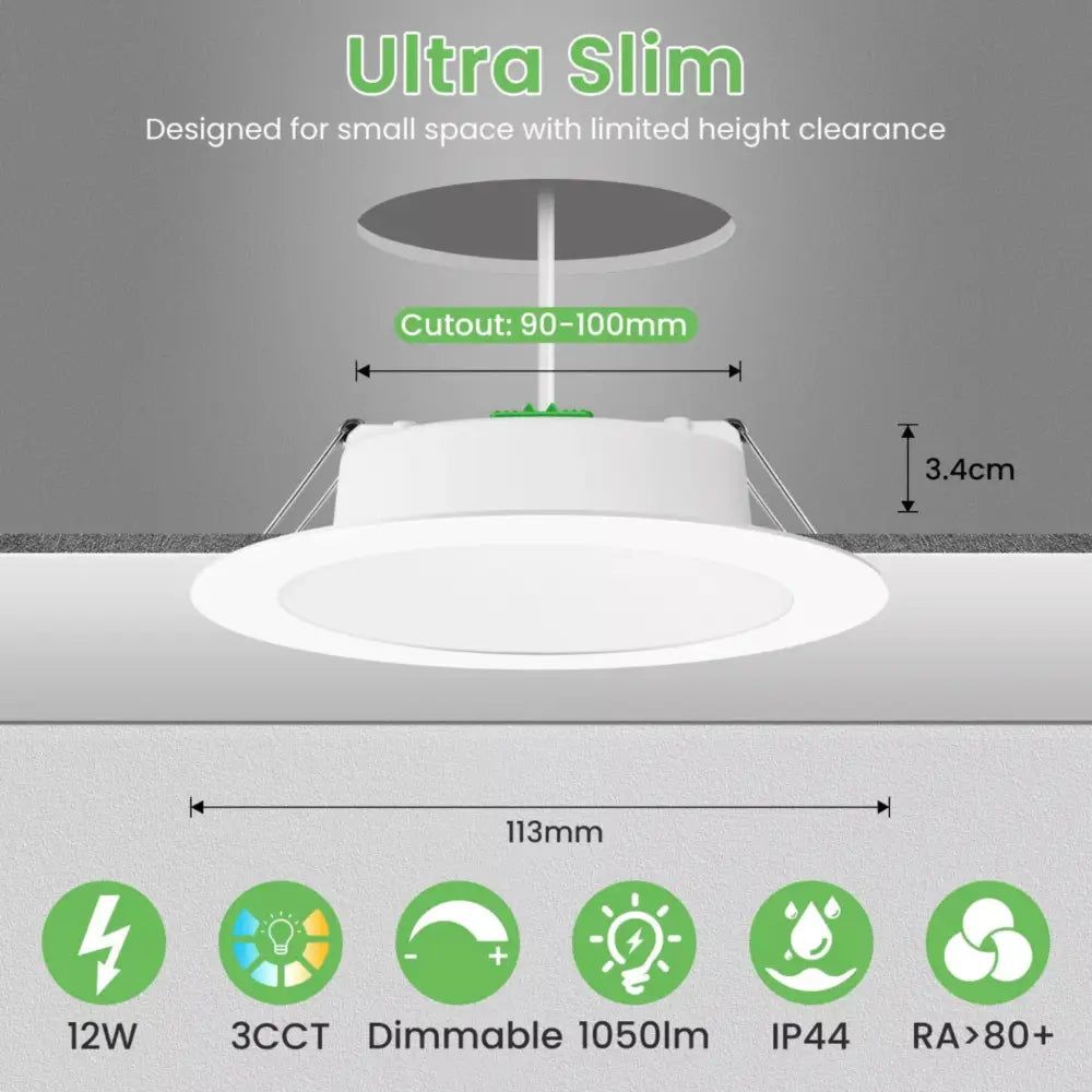 12W Tri-Colour Dimmable LED Downlight | 90mm Cut Out | Sleek