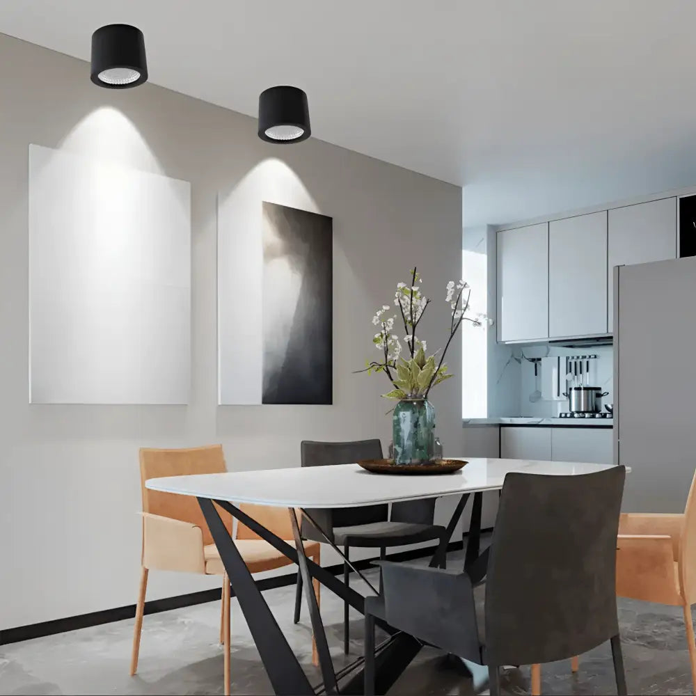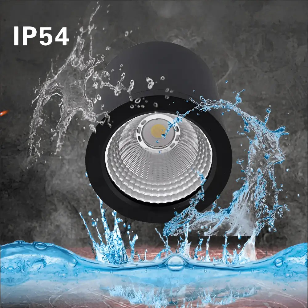 This Surface Mount Tri-Colour 120mm Dimmable LED Downlight has an IP54 weatherproof rating and can be mounted on concrete ceilings in black colour. It includes integrated LED's and allows for Tri-colour selection using a DIP switch with a shifting sequence from 3000K to 4000K to 6000K.