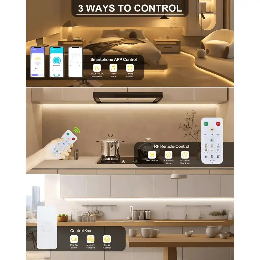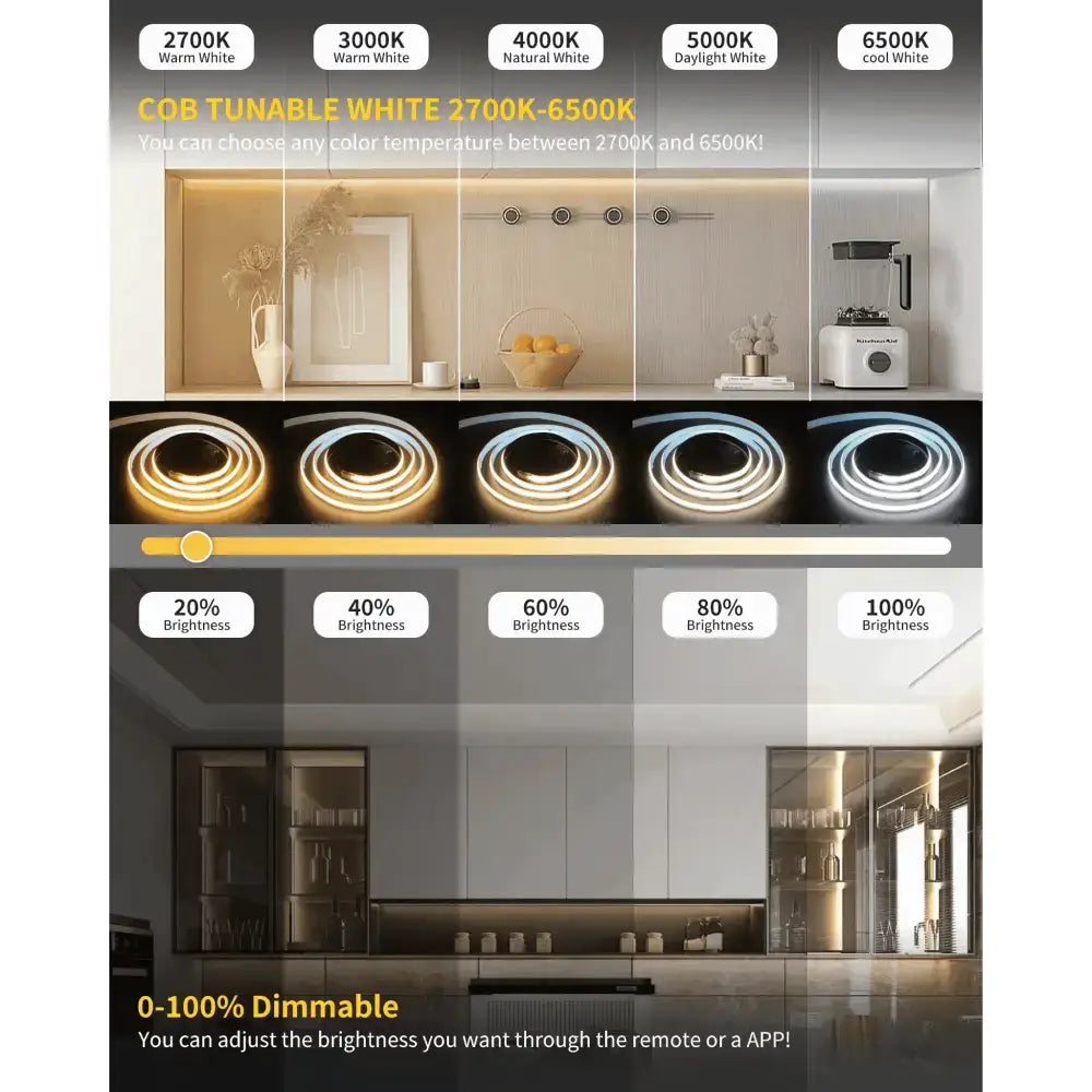 • Full Kit Included: 3m or 5m COB Tunable strip, 24V 3A power supply, controller, and remote