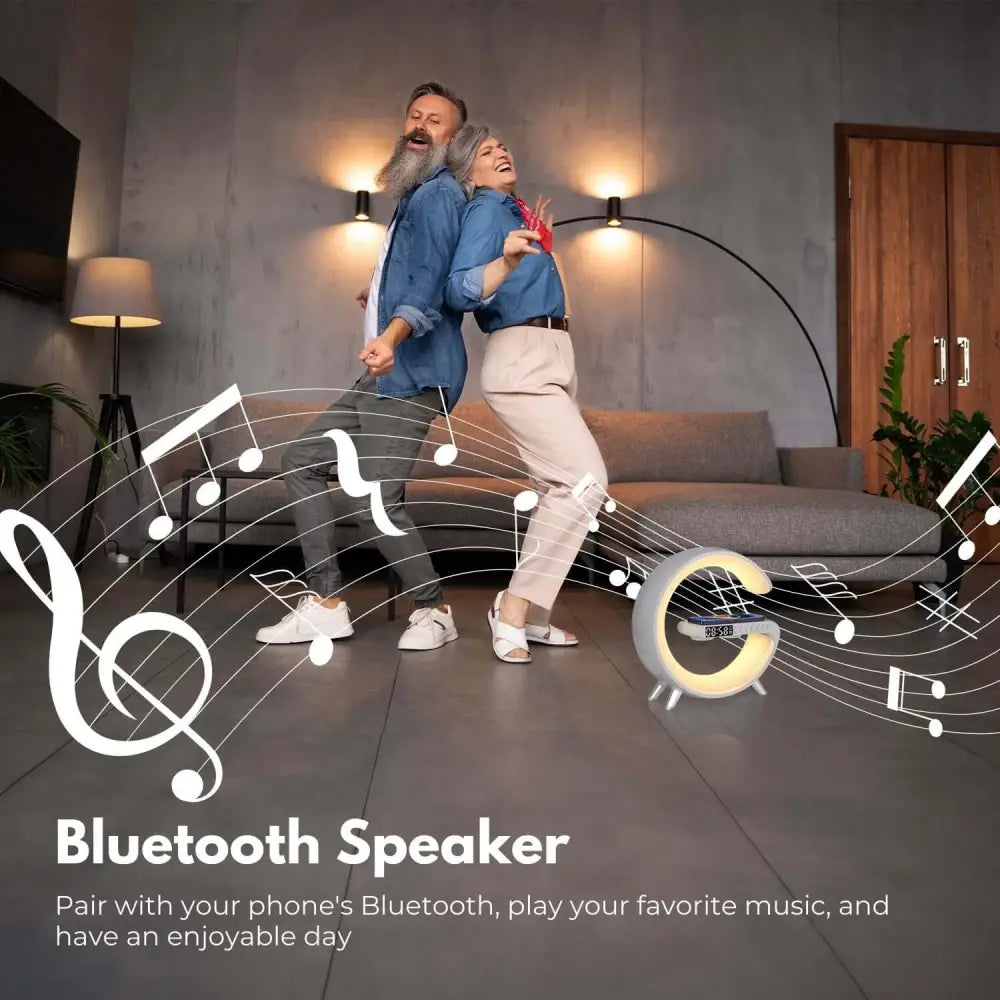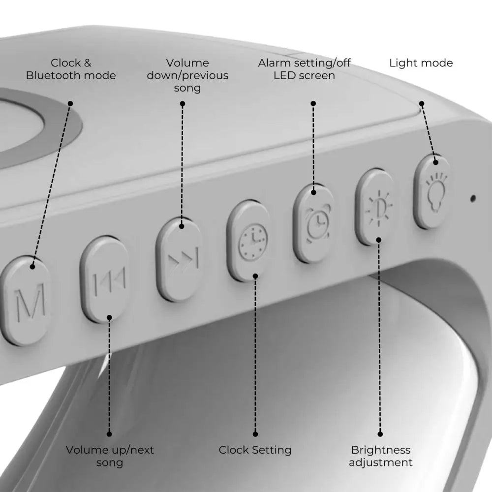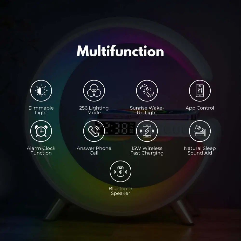 Multi functional bedside lamp: It is not only a bedside table lamp, but also has a 15W fast wireless charging, Bluetooth speaker, music, clock, alarm clock, sleep light, sunrise wake-up light, and atmosphere light.