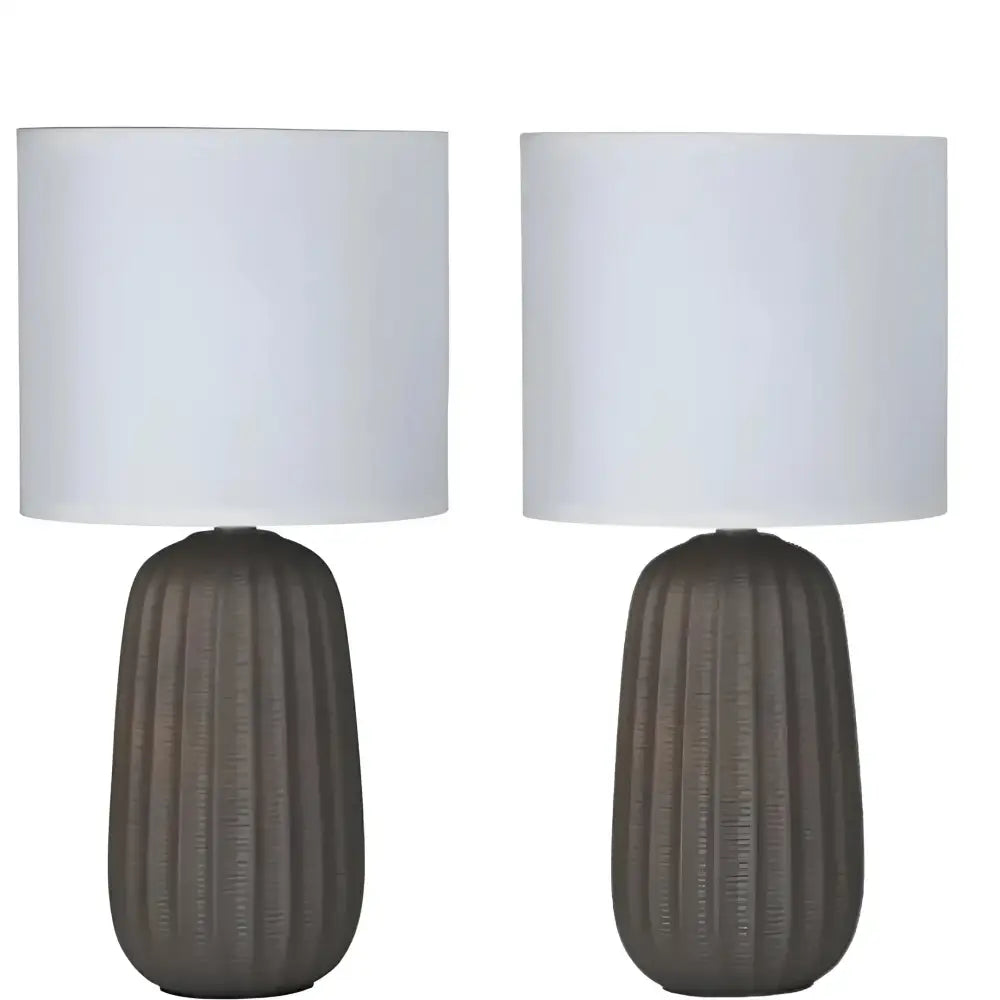 Benjy.20 ceramic table lamp complete with fabric shade. The Benjy base has a textured, matt finish and is supplied with an off-white poly-cotton laminated shade. Switch is on the cord. A nice bedside lamp. Finished in a smart, dark taupe.