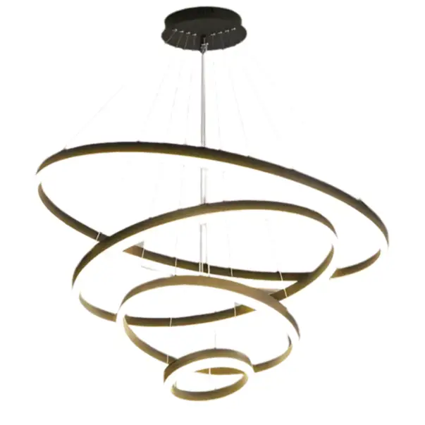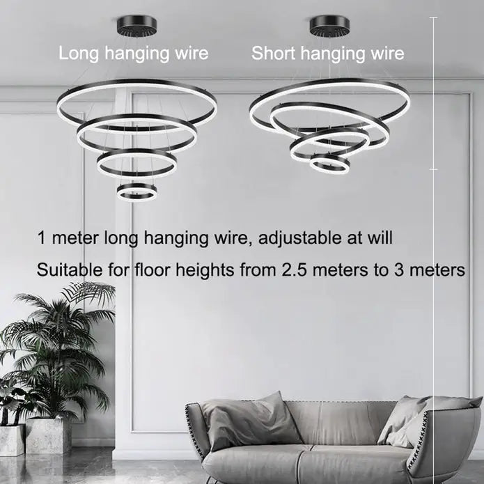 Illuminate your space with our Smart Minimalist LED Pendant Light, featuring an elegant circular design perfect for the living room, dining room, or bar area. This innovative light offers three adjustable color temperatures: white, warm, and neutral, ensuring the perfect ambiance for any occasion. Crafted with a frosted acrylic lampshade and an energy-saving LED light source, it provides high brightness and natural, eye-friendly illumination. The adjustable suspension wire accommodates different ceiling heights, making it versatile for various floor levels. Built with durable materials including acrylic, aluminum, and iron, and finished with a high-temperature baking paint process, this chandelier is both stylish and long-lasting. Available in black or gold, with options for three, four, or five rings to suit your space.