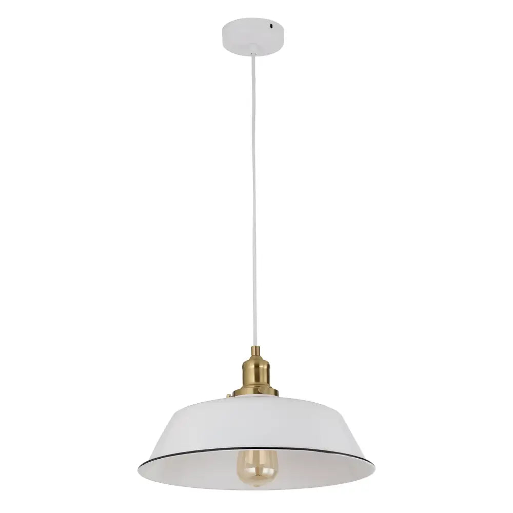 The Cerema White with Antique Brass and Black Highlight Angled Dome Interior Pendant Light provides reliable, high-quality lighting for indoor spaces and adds a sleek design to any décor setting.