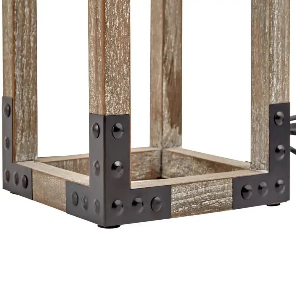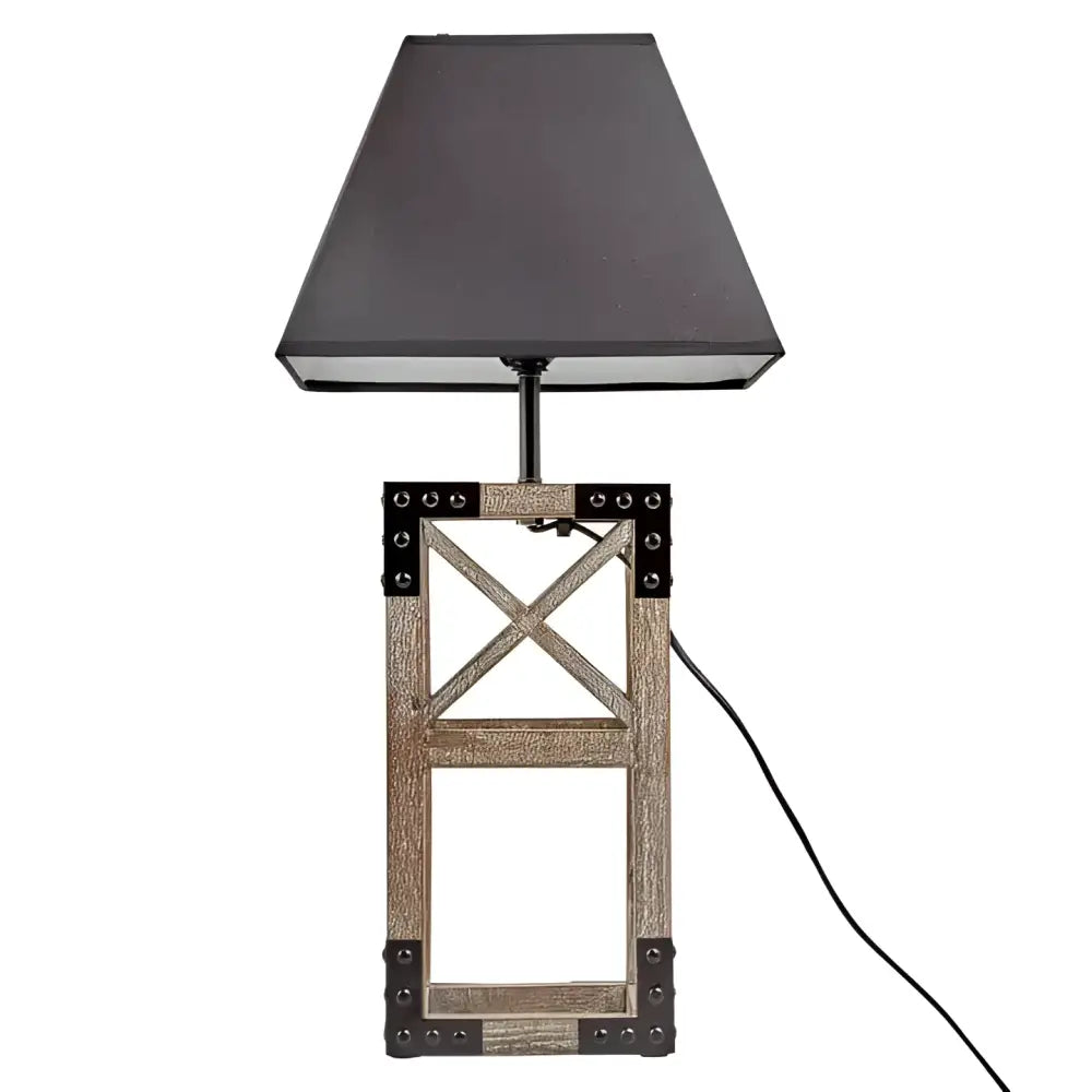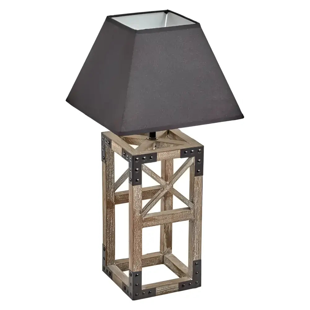 Desk Light Modern wooden square table lamp with steel and black shade. - Solid sturdy square steel frame - Black linen fabric shade - Made from Pine Wood - Inline switch Size: Length: 26cm Width: 26cm Height: 54cm