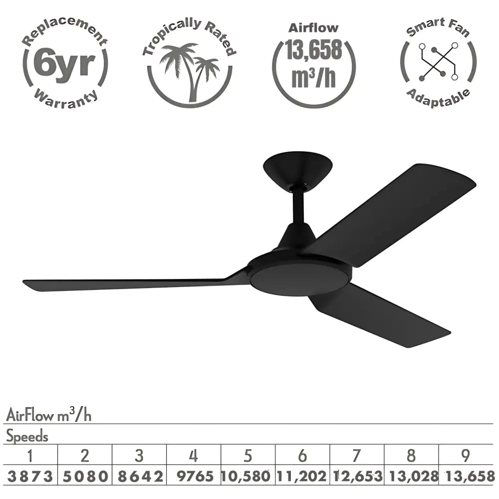 Upgrade your space with the Domus AXIS Black 48” DC Ceiling Fan, a modern and sleek 3-blade fan designed for ultimate performance and style. With a slimline ABS polymer construction, this fan is lightweight, quiet, and built for superior airflow. Its energy-efficient DC motor consumes just 26W at high speed, making it an eco-friendly cooling solution for any indoor or outdoor undercover space.