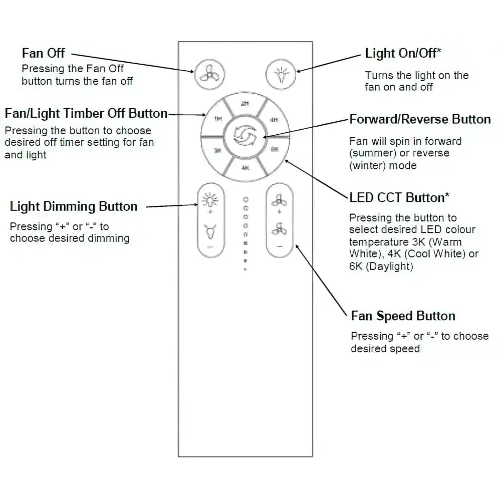 Featuring an 18W switchable CCT LED light, you can easily choose between Warm White (3000K), Neutral White (4000K), or Cool White (6000K) to suit your space. The included remote control offers 9-speed settings, a timer, and reverse Winter/Summer mode, ensuring year-round comfort.