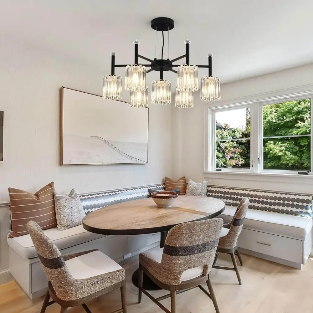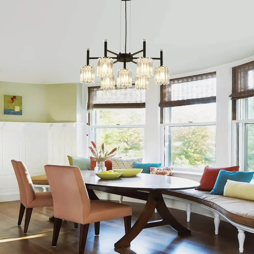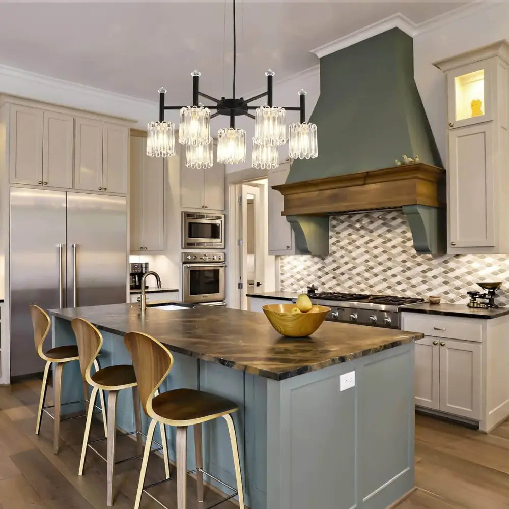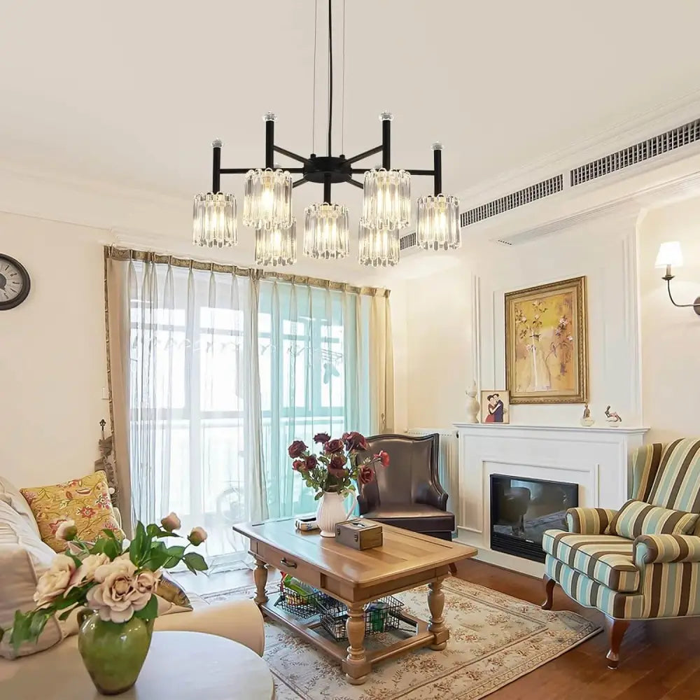 - This modern luxury chandelier features an acrylic lampshade and matte black metal frame, creating a dreamlike atmosphere in any space. Perfect for the dining room, kitchen, bedroom, restaurant, living room, and office.