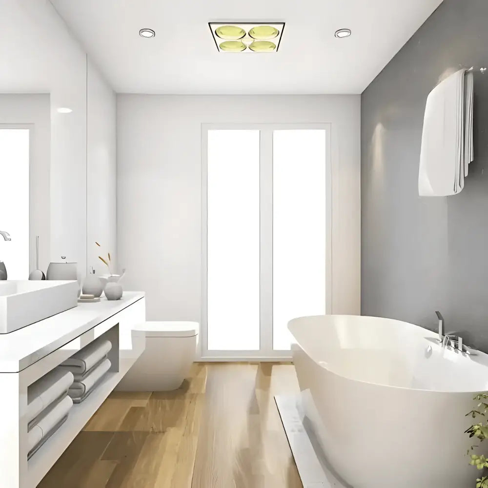 This 3 in 1 Bathroom Heater has four 275W modern heat lamps that provide rapid warmth during the cooler seasons, making the Prime perfect for many bathroom applications.