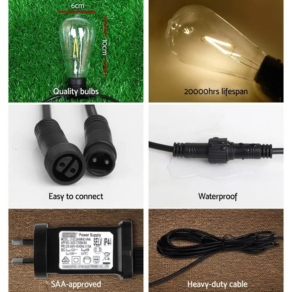 Our Festoon String Lights are great not only for wedding and birthday parties or special events, but also for creating a warm, inviting ambience with its bright and mellow glow. Suitable for both indoor and outdoor use, its IP44 rating means that it can be used in the rain and all weather conditions. Each bulb draws a very low voltage and is placed 90cm equally apart from each other throughout its 59m length for an even distribution of illumination and brightness. Not least, the each bulb has a 20,000 hours lifespan so that you can get to use the string lights for quite a while.