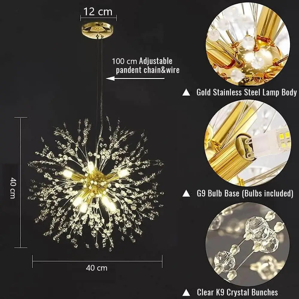 - Create a romantic and luxurious atmosphere in your home with this unique dandelion-shaped crystal firework chandelier. Its K9 crystal flashes brilliantly, illuminating the room with a soft, warm light and adding a touch of elegance to your d�cor. Enjoy a beautiful and unique look that will make your home stand out.