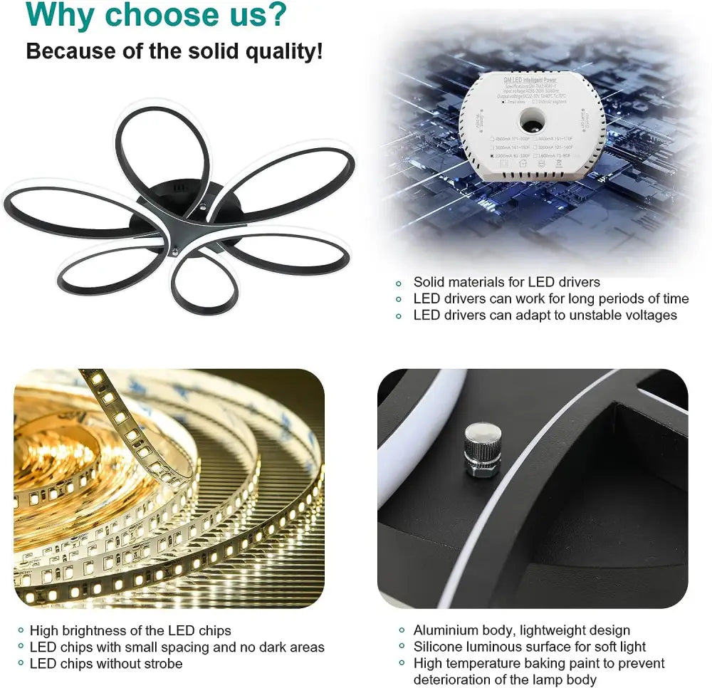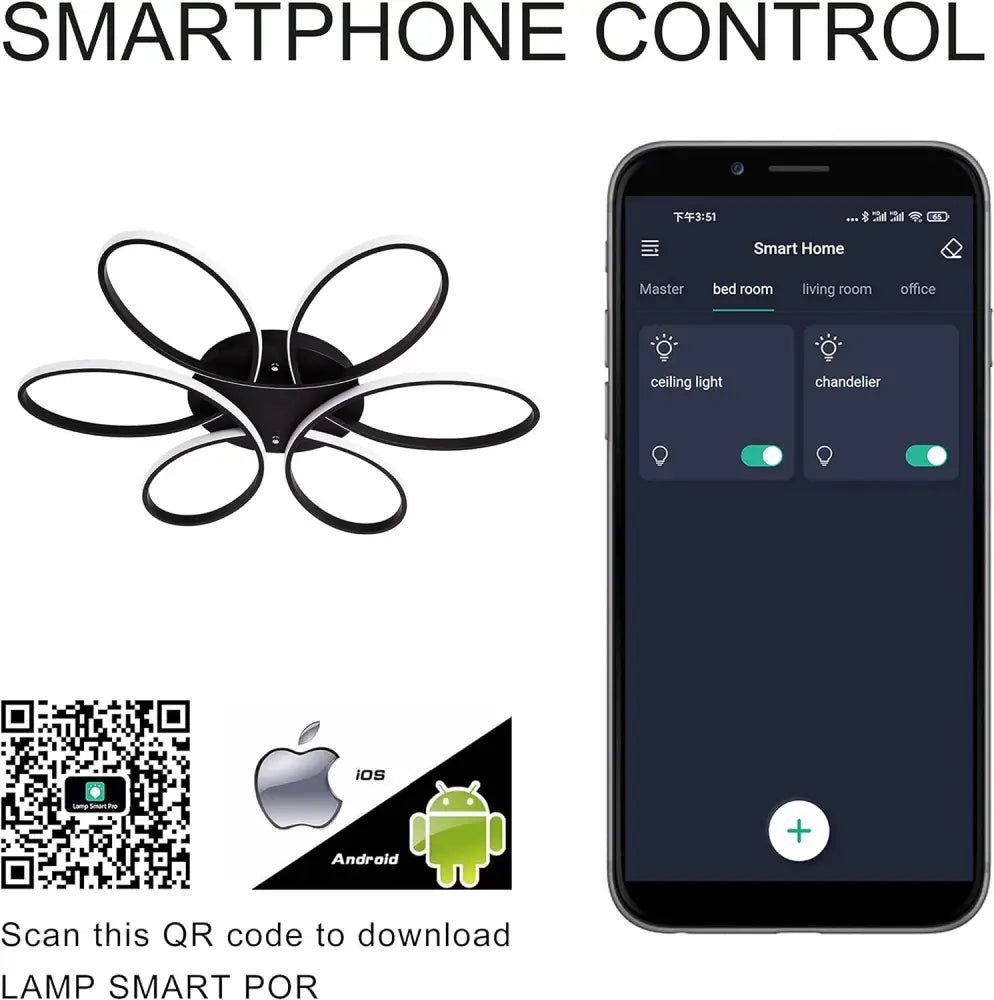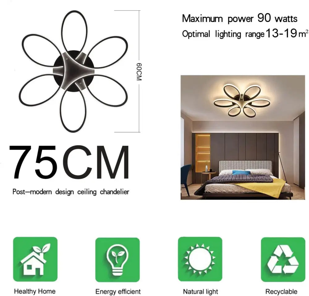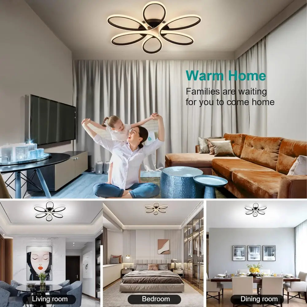 - Illuminate your home with this modern LED chandelier lighting fixture. Features a flush mount design and dimmable remote control for easy adjustment of brightness in any room of your home. Perfect for living rooms, bedrooms, dining rooms, studies, and kids rooms.