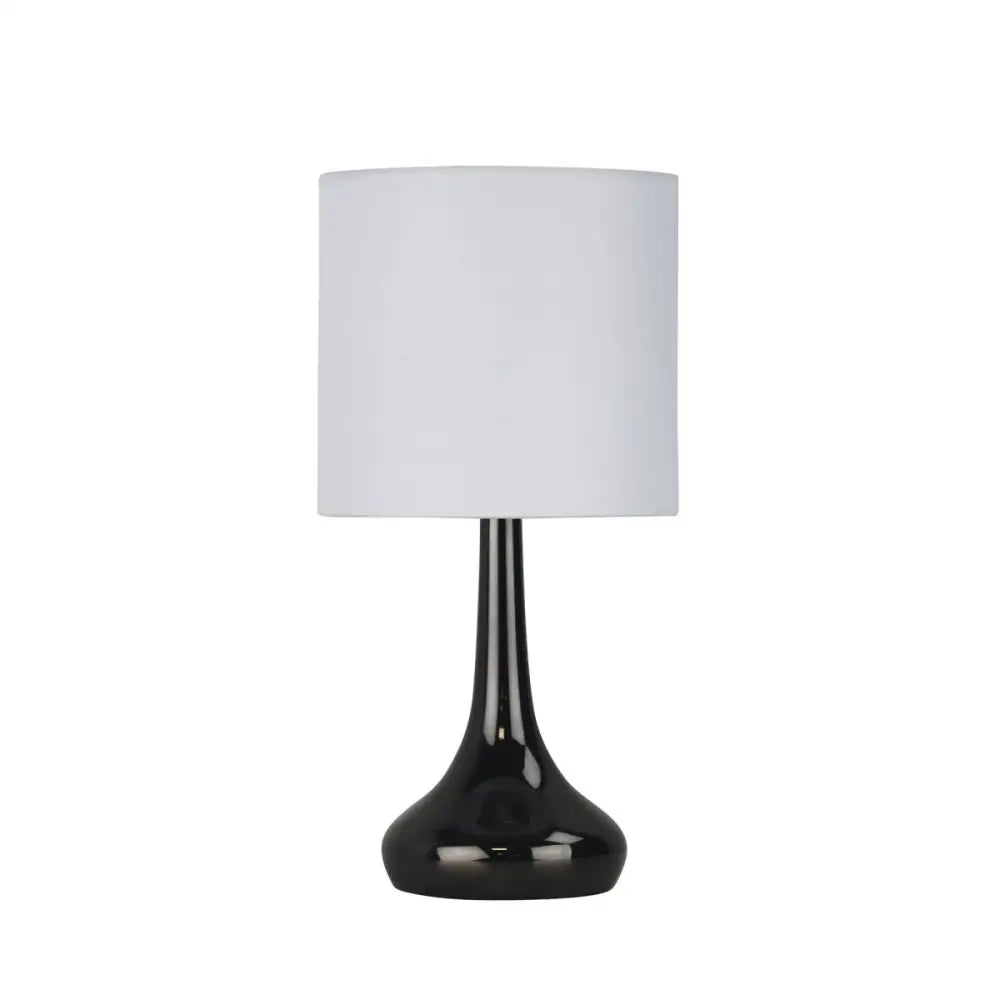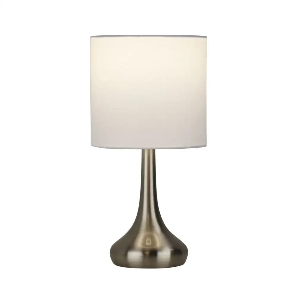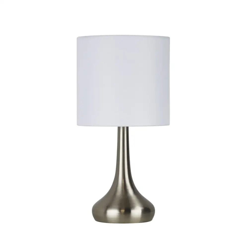 The Lola is a compact touch table lamp from Oriel that is available in Antique Brass, Brushed Chrome or Gunmetal metalwork, completed with a white poly cotton drum shade. On/Off touch switch makes this a great bedside lamp. Uses a Small Edison Screw (E14) globe. Suitable for LED energy saving globes.