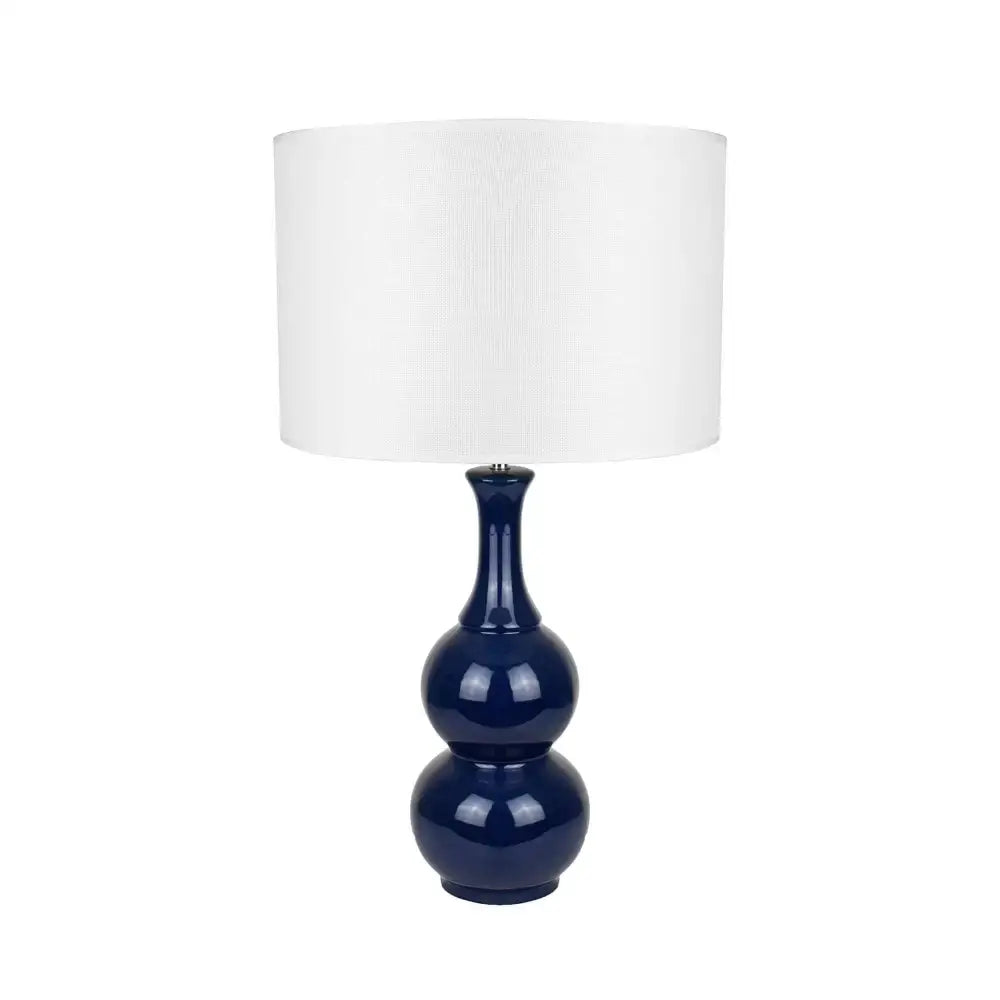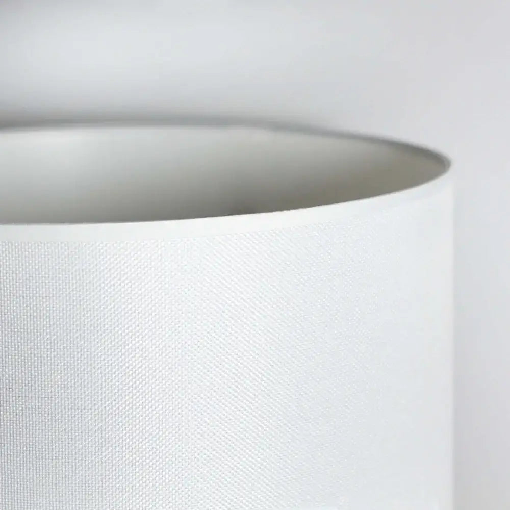 The Pattery Barn Table Lamp utilises a classic pottery wheel inspired ceramic base design with two spherical features and a spindle-shaped neck. The cylindric white fabric lampshade is supported on a short chrome stem.