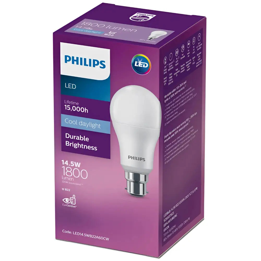 Upgrade your lighting with the Philips 14.5W A60 MegaBright LED bulb, delivering 1800 lumens of high-quality illumination while using over 80% less energy than traditional incandescent bulbs. This extra-bright LED globe is the perfect replacement for outdated 120W incandescent or 25W compact fluorescent bulbs, providing superior brightness in a more energy-efficient design.