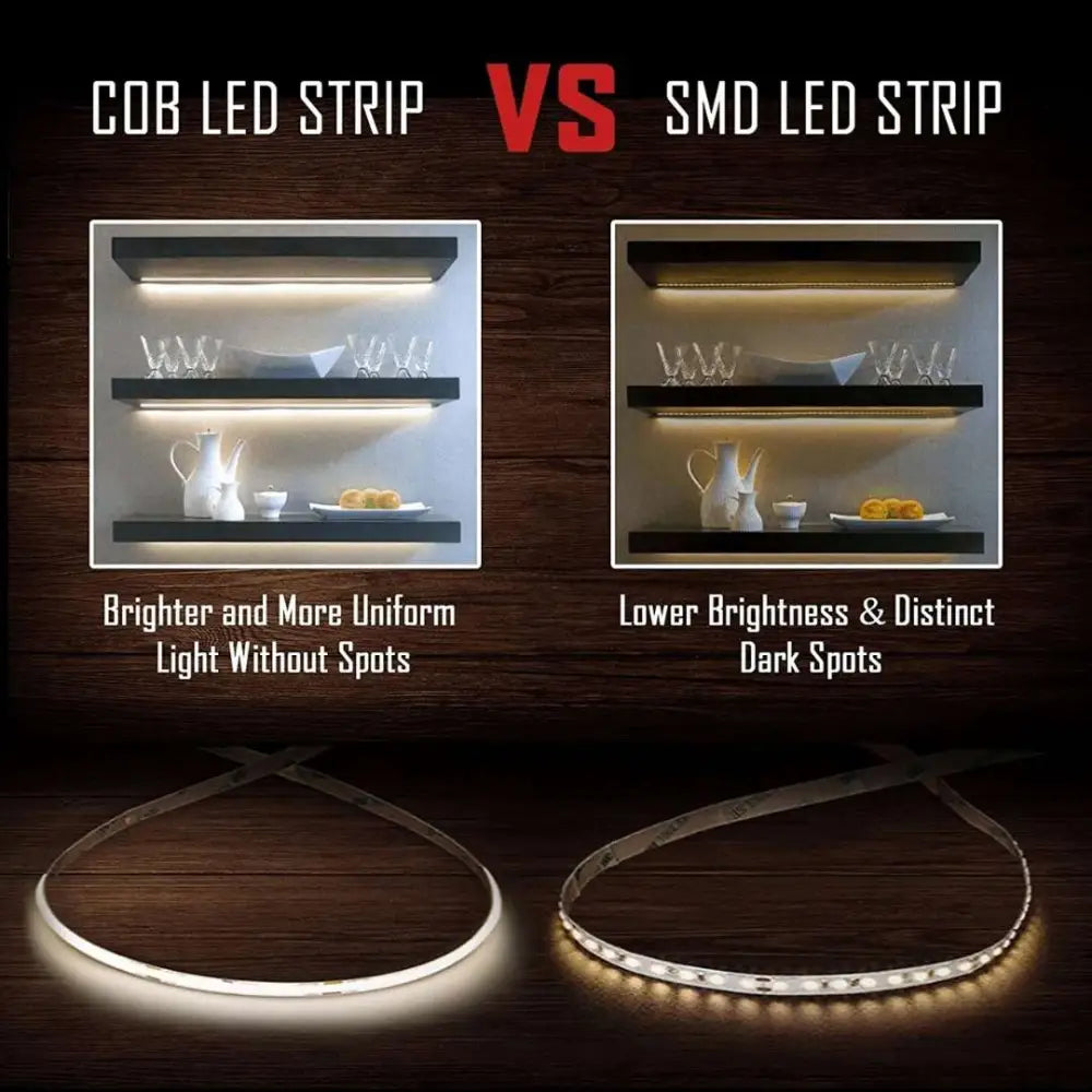 In addition to it’s features as pointed out above, COB LED Strip produces around 25% more light output per watts than that of SMD, this increase in light output reduces the overall power consumption required. They are also more flexible and have a greater light distribution angle.