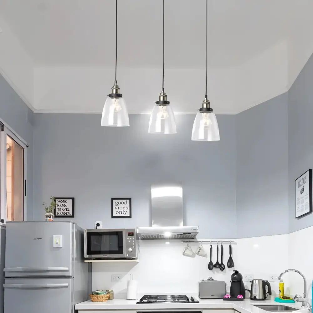 Clear glass cup-style covers allow light to filter through the room at full brightness and would make a perfect matching lighting design throughout an open living space where the kitchen meets the dining or living room area.