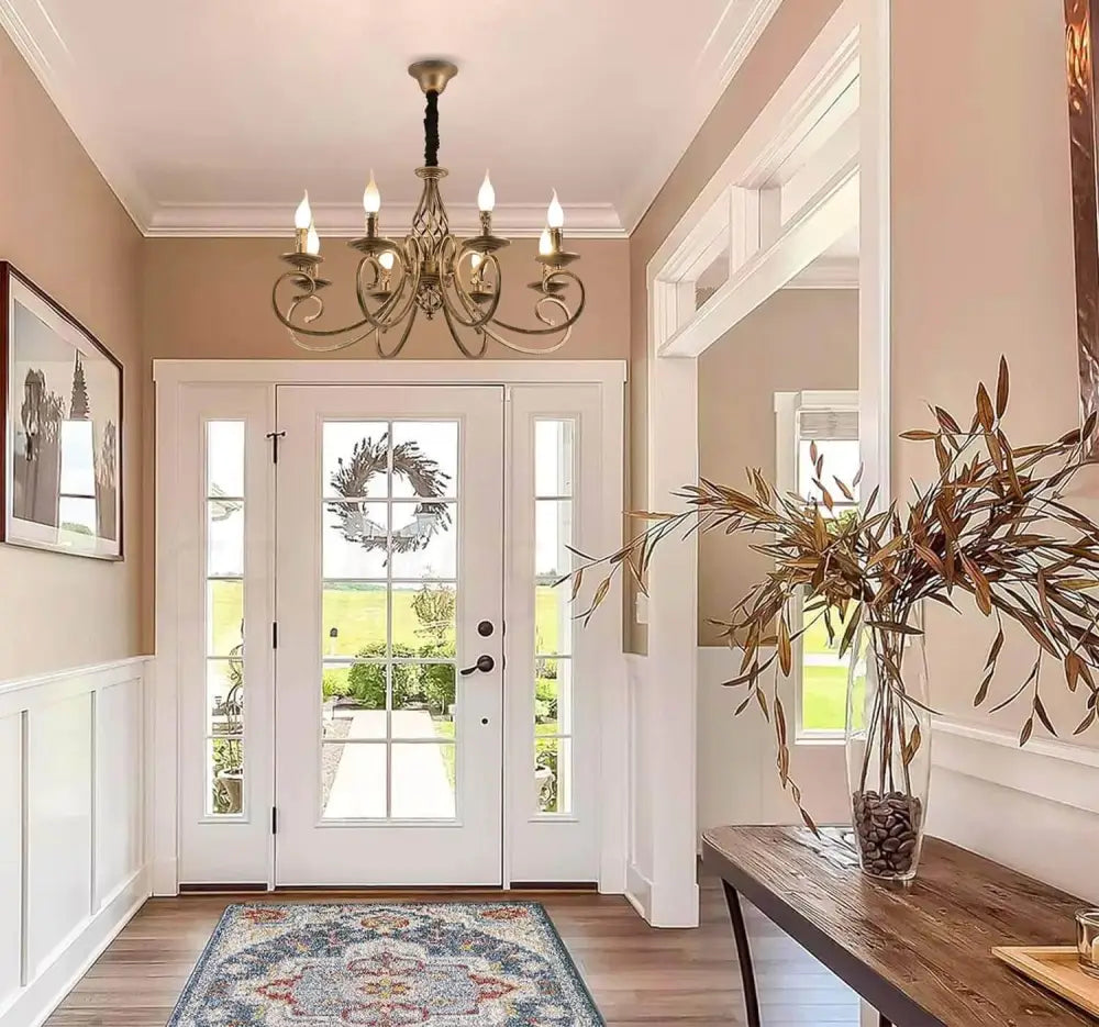 - This vintage chandelier is the perfect addition to any farmhouse, barn, or country-style home. Crafted with a durable metal frame and 8 simply curved iron arms, each holding a candle-shaped bulb stem with a dish cup, it adds a rustic and mid-century charm to any room. Ideal for kitchen islands, dining rooms, living rooms, bedrooms, little houses, and hallways, this chandelier will complete the look of your space.