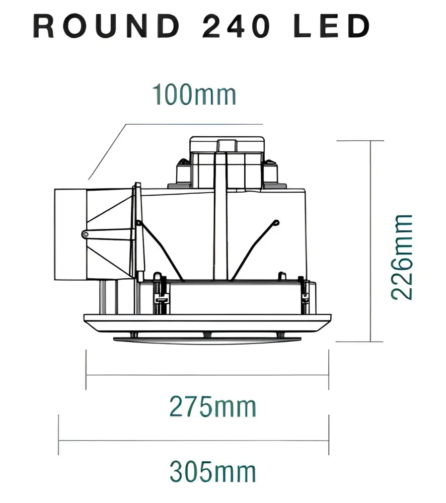 Featuring a durable polypropylene (PP) housing with a minimalist white fascia, the Saturn 240 integrates seamlessly into modern ceilings. Its 17W LED light offers tri-colour switching (3000K / 4000K / 5000K), allowing your installer to customise the room’s ambience. The integrated backdraft stopper helps prevent air leakage, while the quiet operation (≤40dB) ensures a peaceful environment.