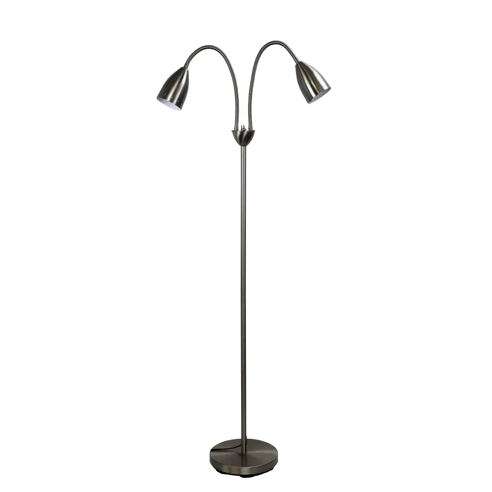 - STAN is a mid-century styled twin floor lamp featuring flexible goose-neck arms with metal shades.