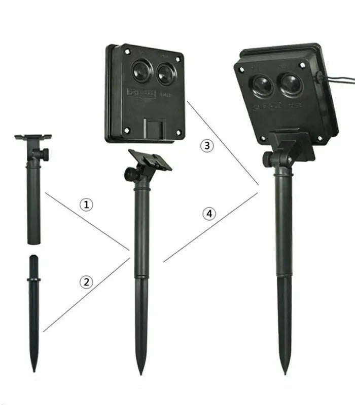 - For installation, attach the pointed ground stake to the bottom of the pole then slide the solar panel box into the top of the pole. Press ON/OFF switch to turn on the light. Press the Mode switch to change the flashing style.