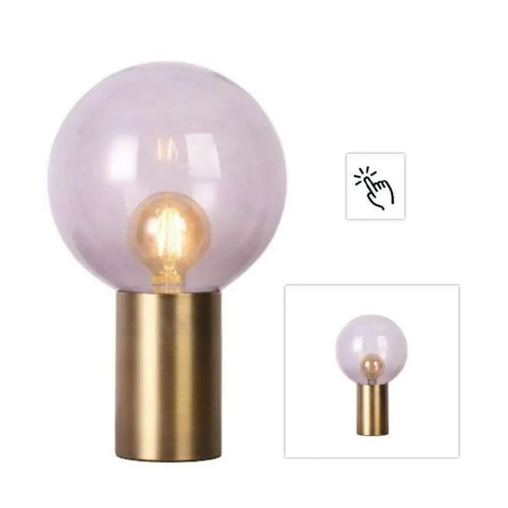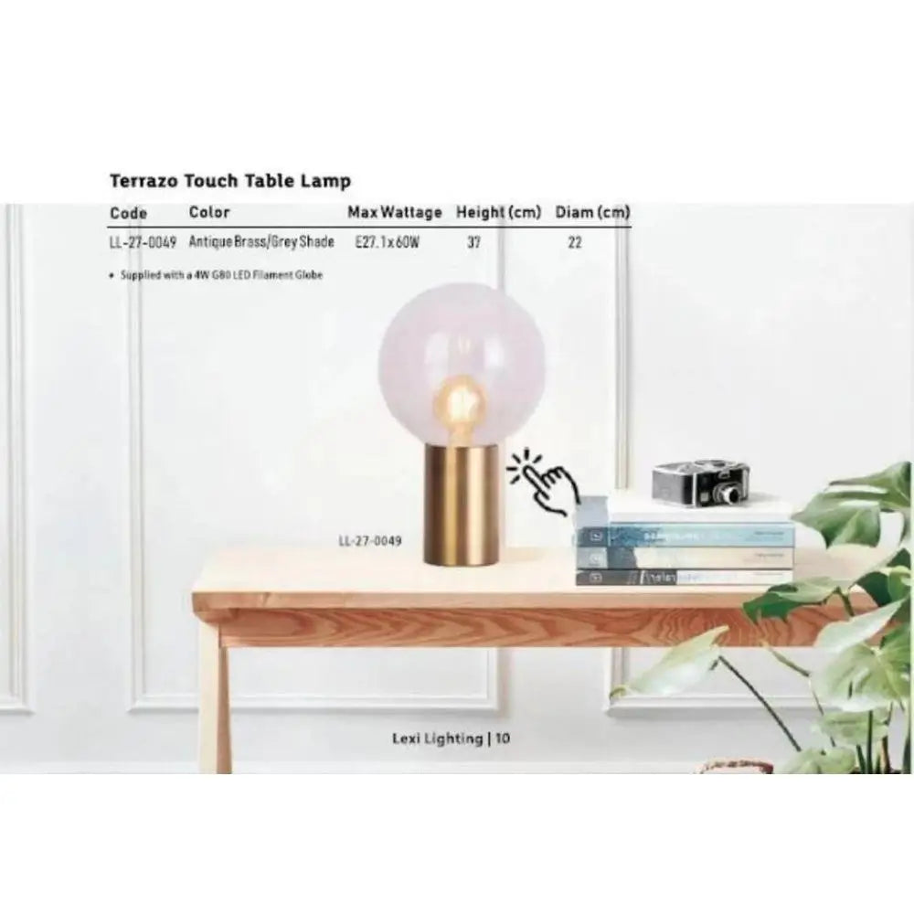 TERRAZO table lamp Series is a modern touch lamp with an Antique Brass cylindrical metal base and a smoke coloured shade covering a filament globe. Ideal for bedside tables, living rooms and children's bedrooms as a night light.