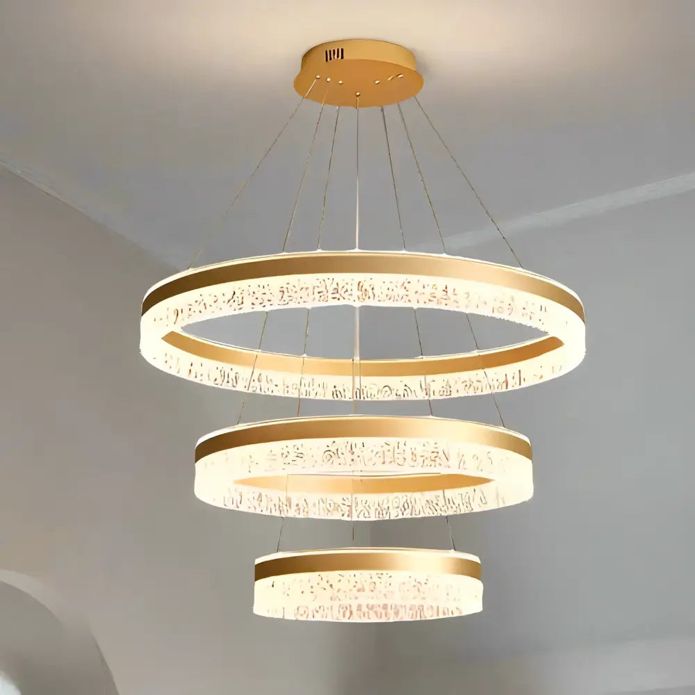 Enhance your living space with our Modern Luxury Ring Pendant Light. This stylish and elegant chandelier features a water ripple design, offering a sophisticated touch to your living room, dining room, or bar area. The light provides flicker-free, fine, and natural illumination, with three adjustable colour temperatures: cool white, warm white, and warm yellow, to suit any ambiance. The adjustable suspension wire fits different ceiling heights, making it adaptable for various floor levels. The acrylic light diffuser, precision laser-cut lampshade, and energy-saving LED light source ensure high brightness, true colour rendering, and eye protection. Built with durable materials including acrylic, aluminum, and iron, and finished with a high-temperature baking paint process, this chandelier is both beautiful and long-lasting. Available in a luxurious gold colour with three rings of sizes 40cm, 60cm, and 80cm.