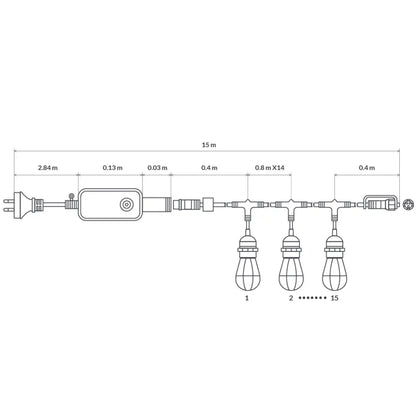 - 15m long, with 15 LED bulbs smart RGBCW coloured festoon string; commercial-grade cable
