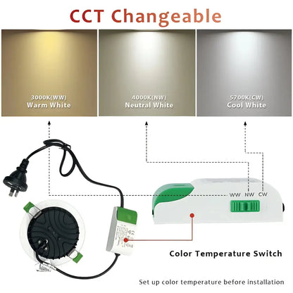 This 40W Tri-Colour LED Downlight boasts a striking polycarbonate body and a corrosion-resistant powder coating, exuding a luxurious quality that is further enhanced by its commercial grade aluminium die cast heat sink. You can easily adjust the ambiance with a simple flip of the switch on the remote driver, selecting from a range of color temperatures, including 3000K (warm white), 4000K (cool white), and 6000K (daylight). Accompanied by a remote flicker-free Trailing Edge driver, this downlight ensures a seamless and elegant experience.