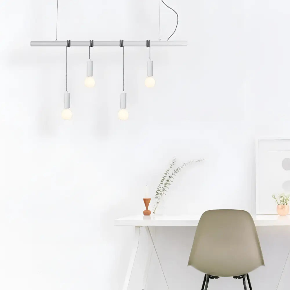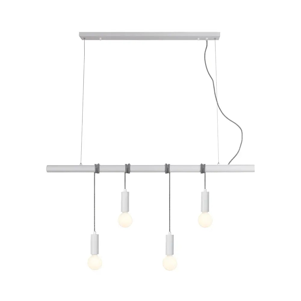 The four globe holders that drop from the lighting bar each have long grey braided cords that can be wrapped around the lighting bar to set heights individually. The heights can set to your preference, whether after a staggered look, or a short non-invasive drop, or a long, purposeful hang. The Bikkel Four Light Pendant comes in black and white and requires four E27 globes.