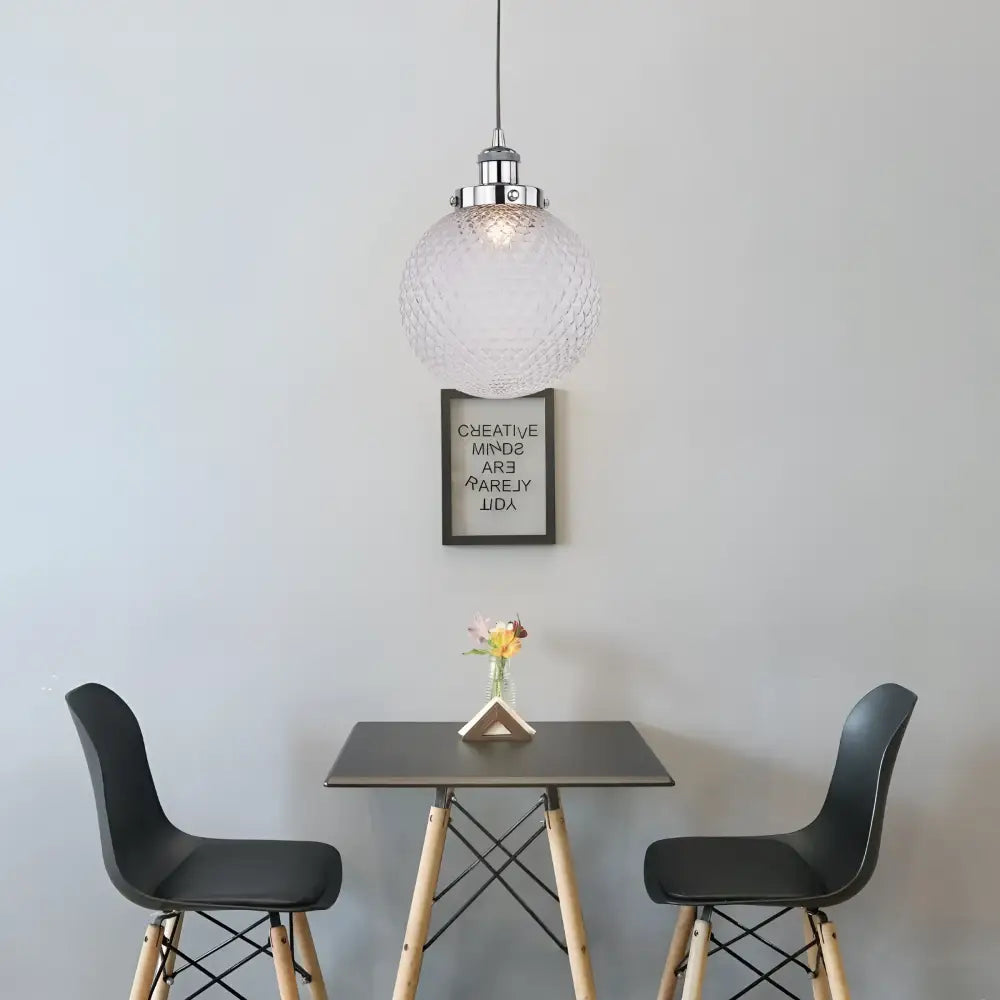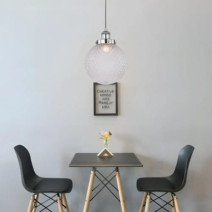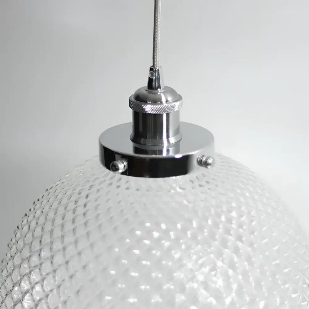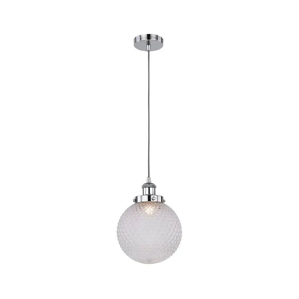 The Casablance Pendant Light offers a classic spherical design that scatters light via a dimpled diamond glass cover. The ceiling mount and main fixture feature a striking chrome finish from which the sphere hangs.