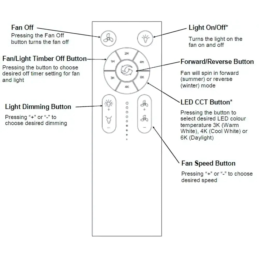 Featuring an 18W switchable CCT LED light, you can easily choose between Warm White (3000K), Neutral White (4000K), or Cool White (6000K) to suit your space. The included remote control offers 9-speed settings, a timer, and reverse Winter/Summer mode, ensuring year-round comfort.